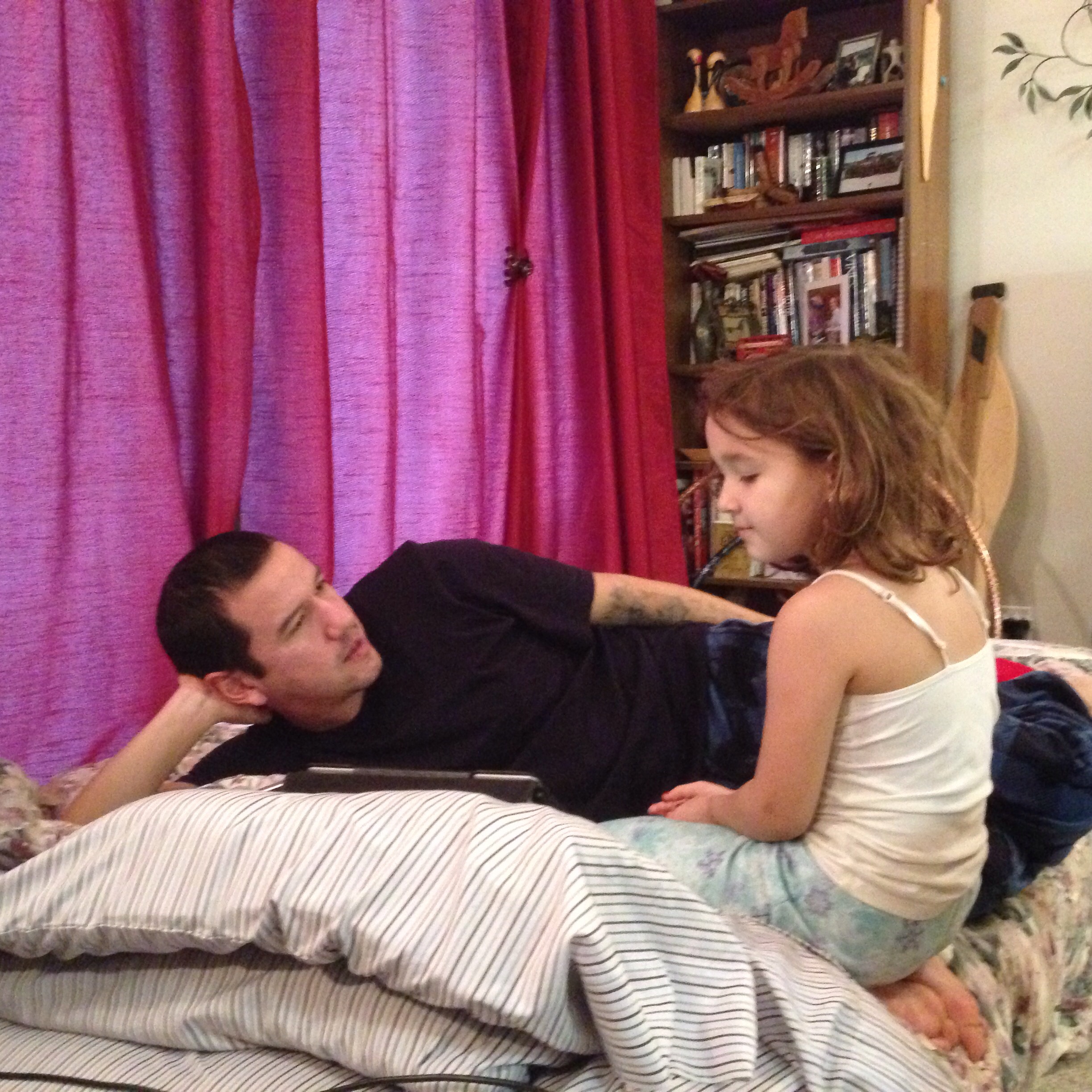 Listening to the duck song on the futon bed with her Dad after our good pancake breakfast.