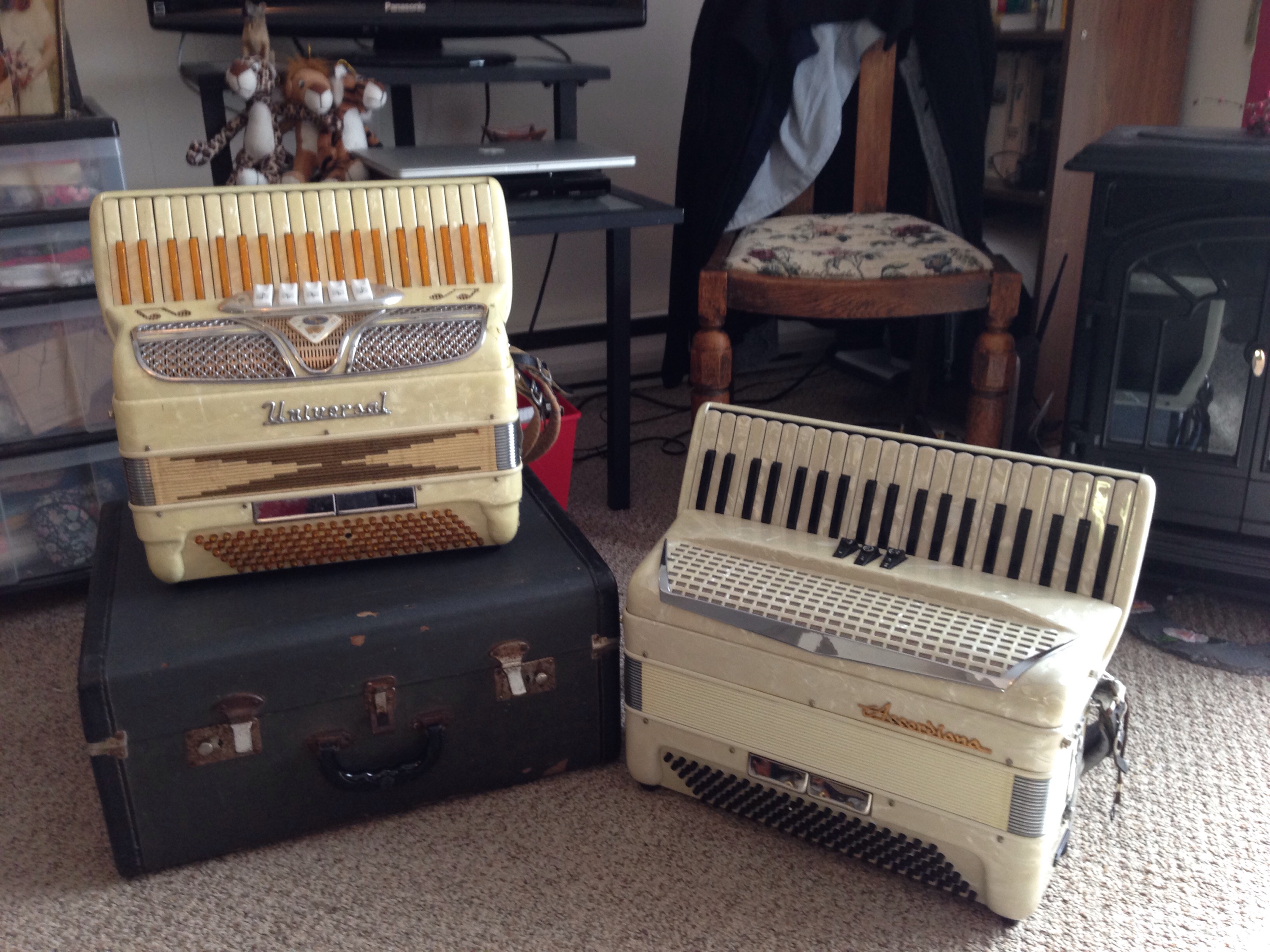 When I came to Canada, I left two accordions behind in Scotland. My sister sent on the smaller one to me some time later. Wish I had been able to have my bigger one too. However…….I did purchase another slightly bigger one later on, and I have an even smaller one as well! I could start my own band! 😉