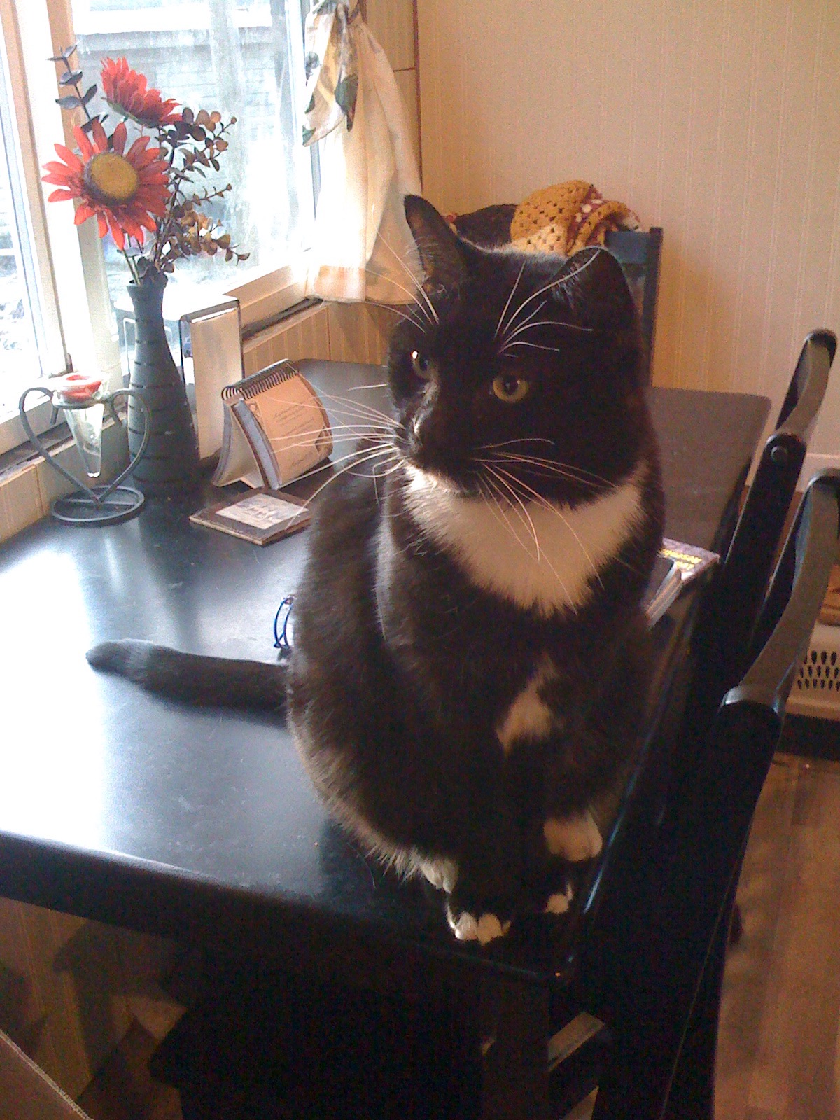 Just taking a moment to remember one of my cats, Miss Whiskers. Here she is, seated on the table in my old house, right before I told her to get off! I don’t like cats on the table, but it just looked like a cute pic, so I snapped it before I shoo’ed her away.