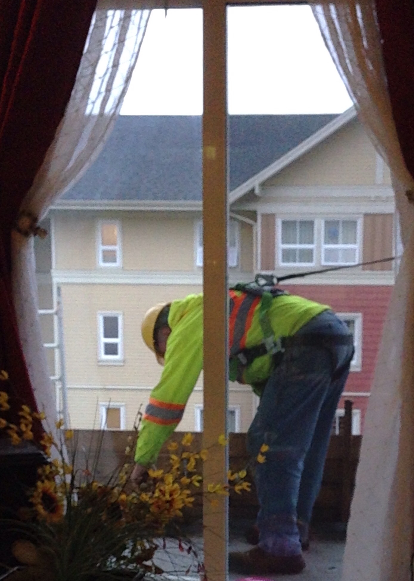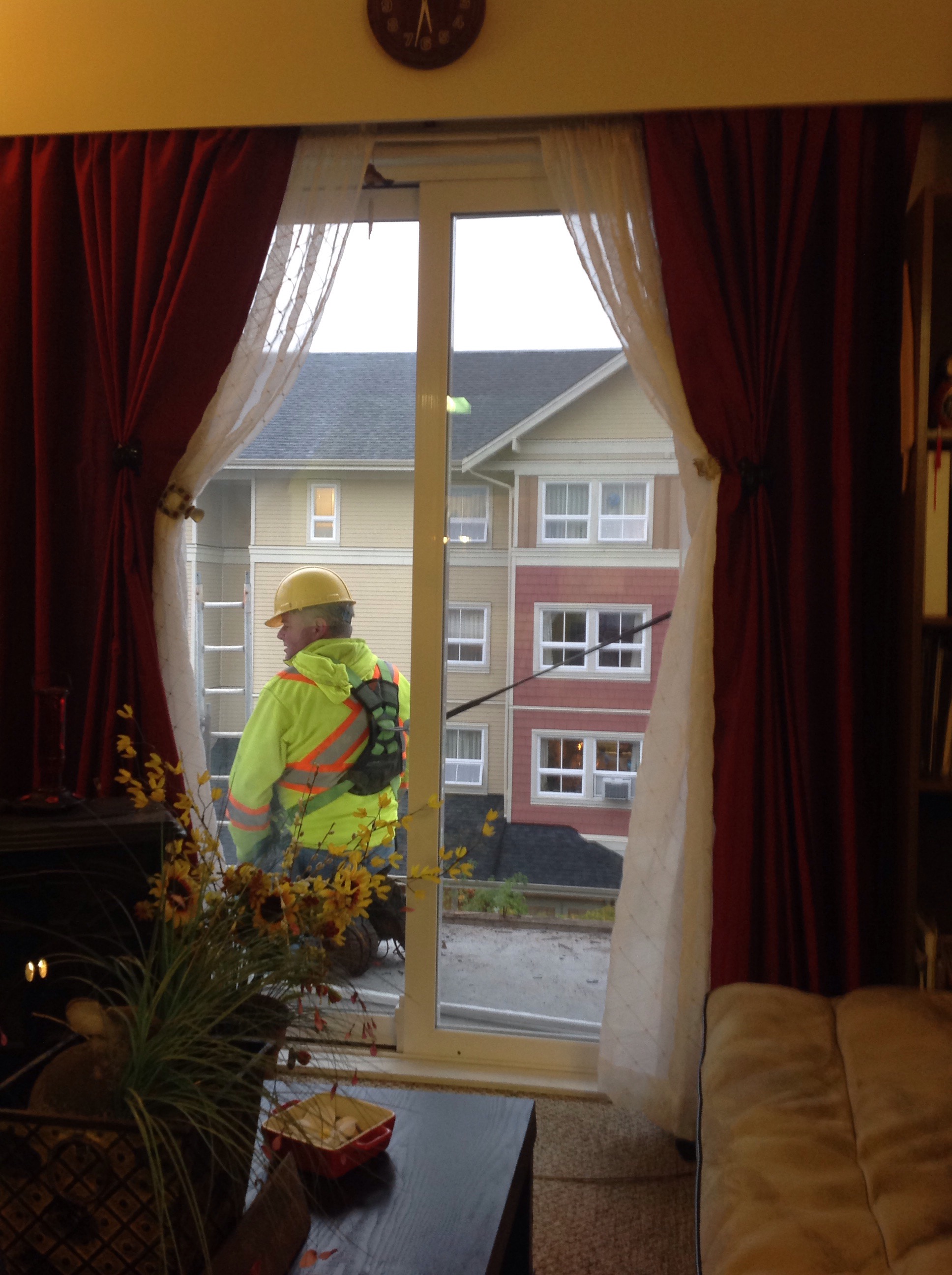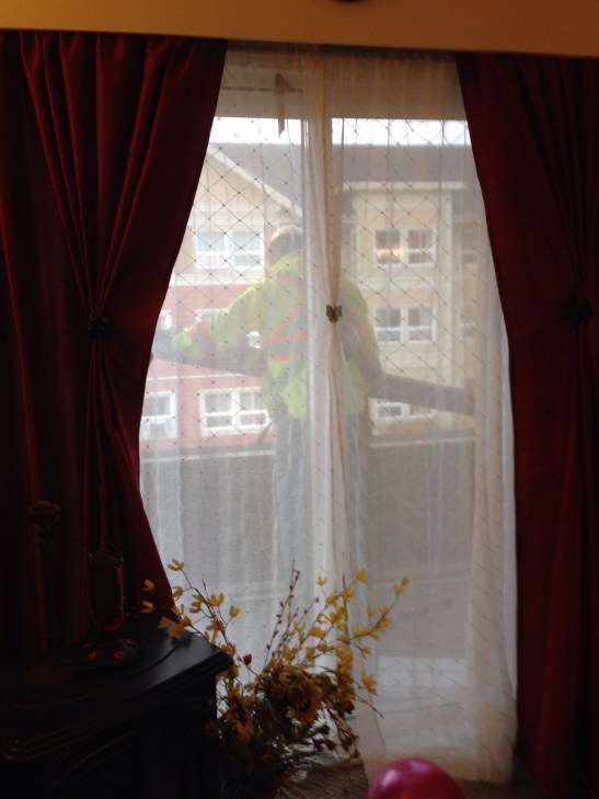 My nephew said he looked like a big Ninja Turtle out there, so here is a pic of the big, happy, flying-equipped (see his attached cable?) Ninja Turtle doing his job on the top floor of our building…..