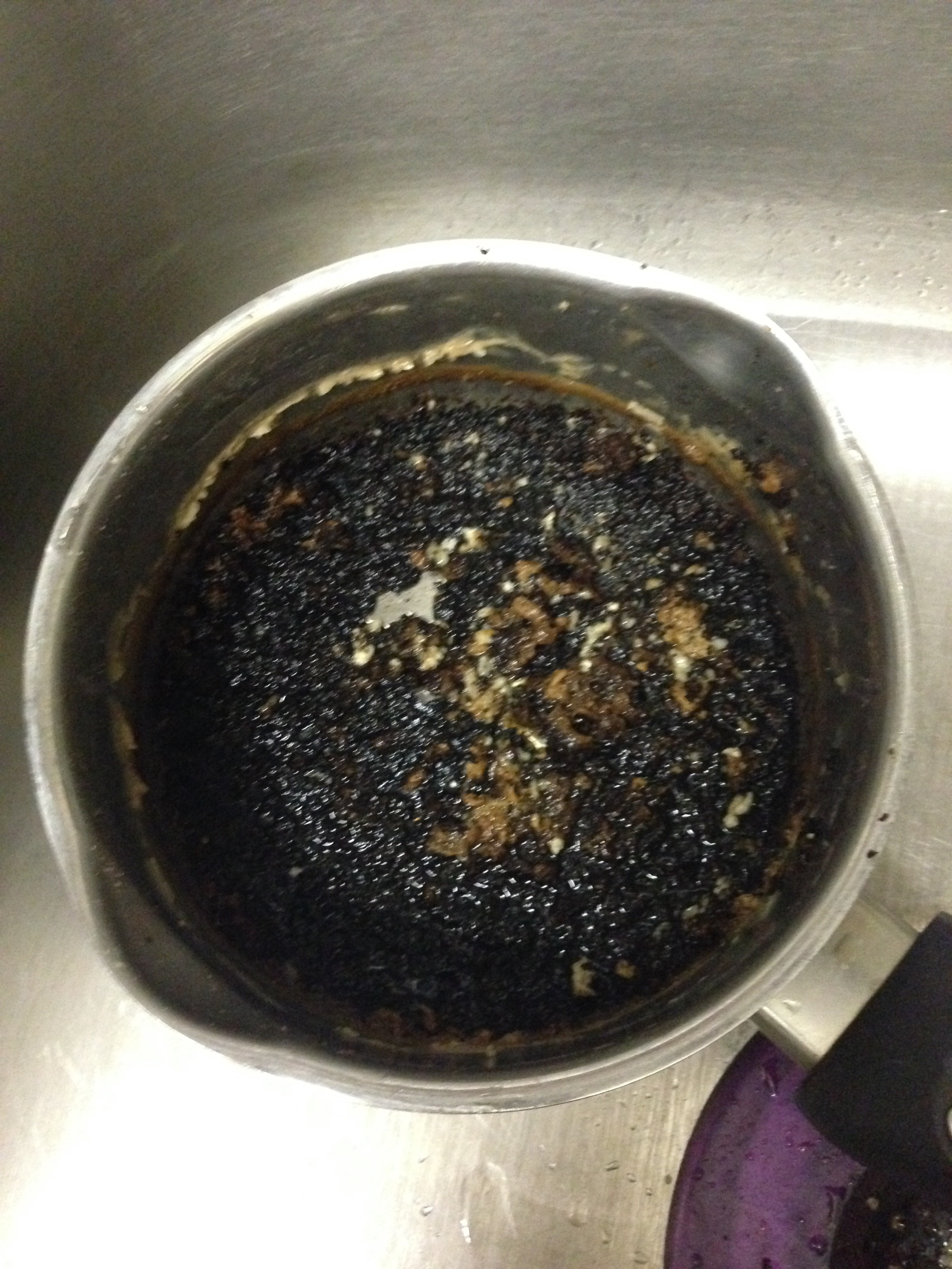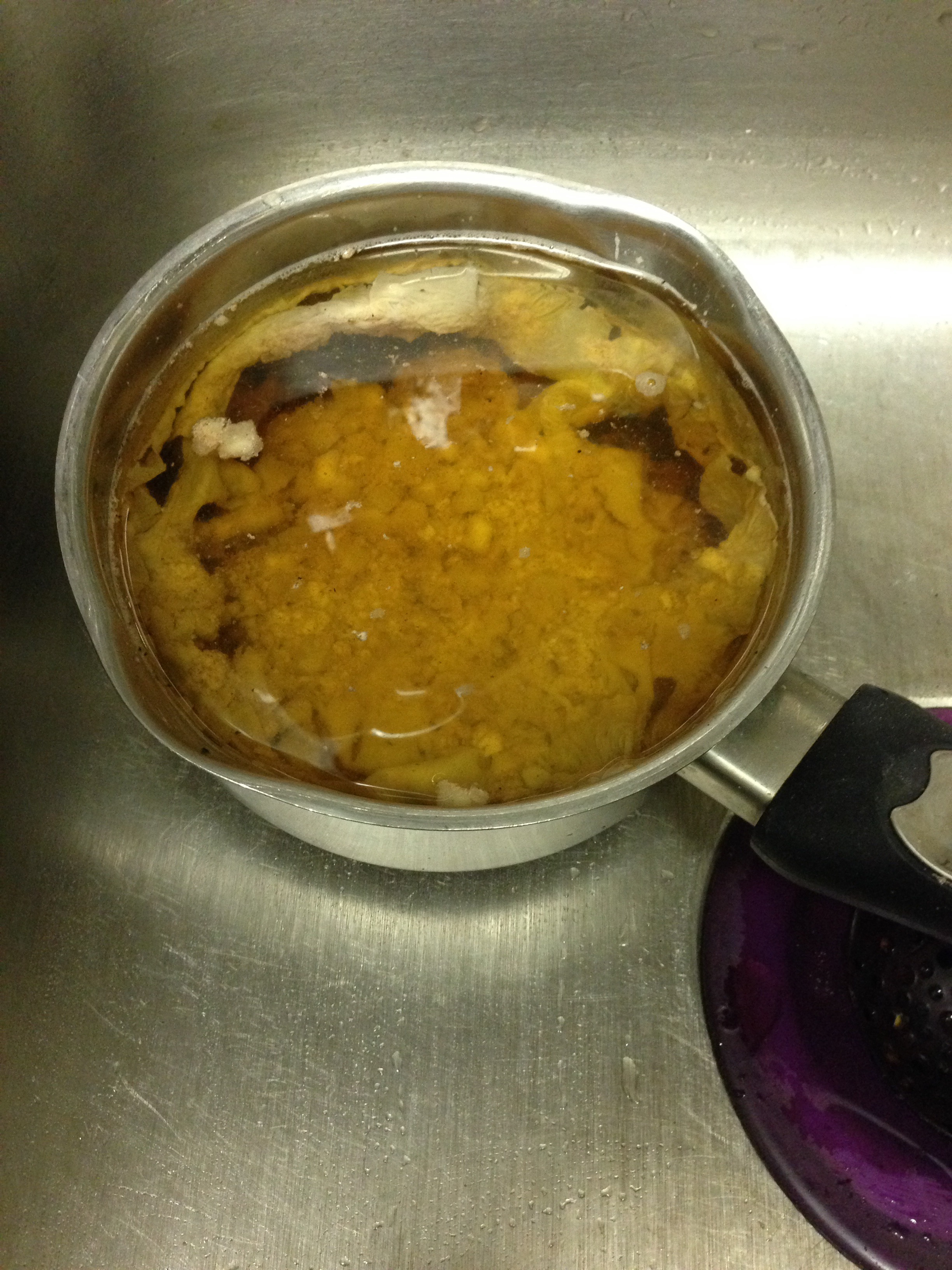 Burner is off. Pan with strange looking content is soaking sadly in the sink. So much for the late night snack, and maybe my pan 😦