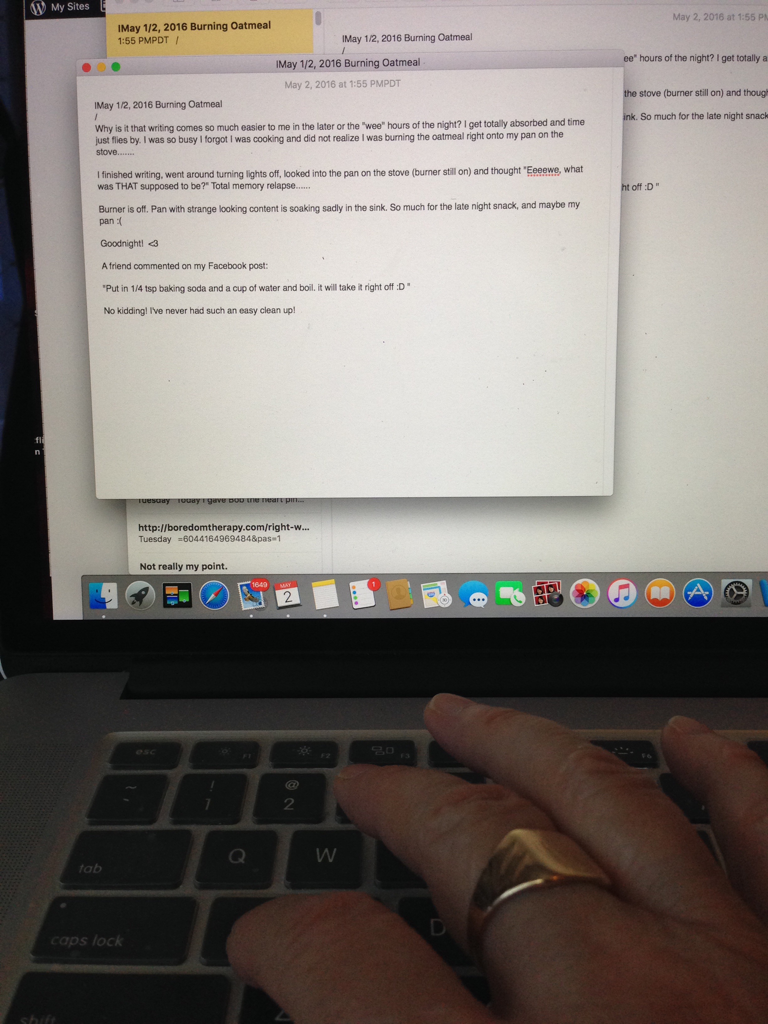 Why is it that writing comes so much easier to me in the later or the “wee” hours of the night? I get totally absorbed and time just flies by. I was so busy I forgot I was cooking and did not realize I was burning the oatmeal right onto my pan on the stove…….