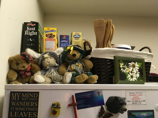 Ok. My soft and furry friends sit on guard by the cereal. I know, it’s crowded up there. But I love to see my little friends.