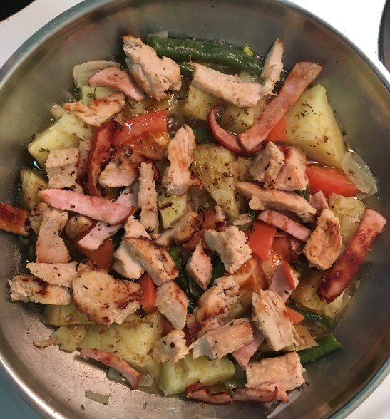 Sweet potatoes, green beans, onion, tomato, bacon and turkey bits. A dash of fine herbs and a sprinkle or two of brown sugar….