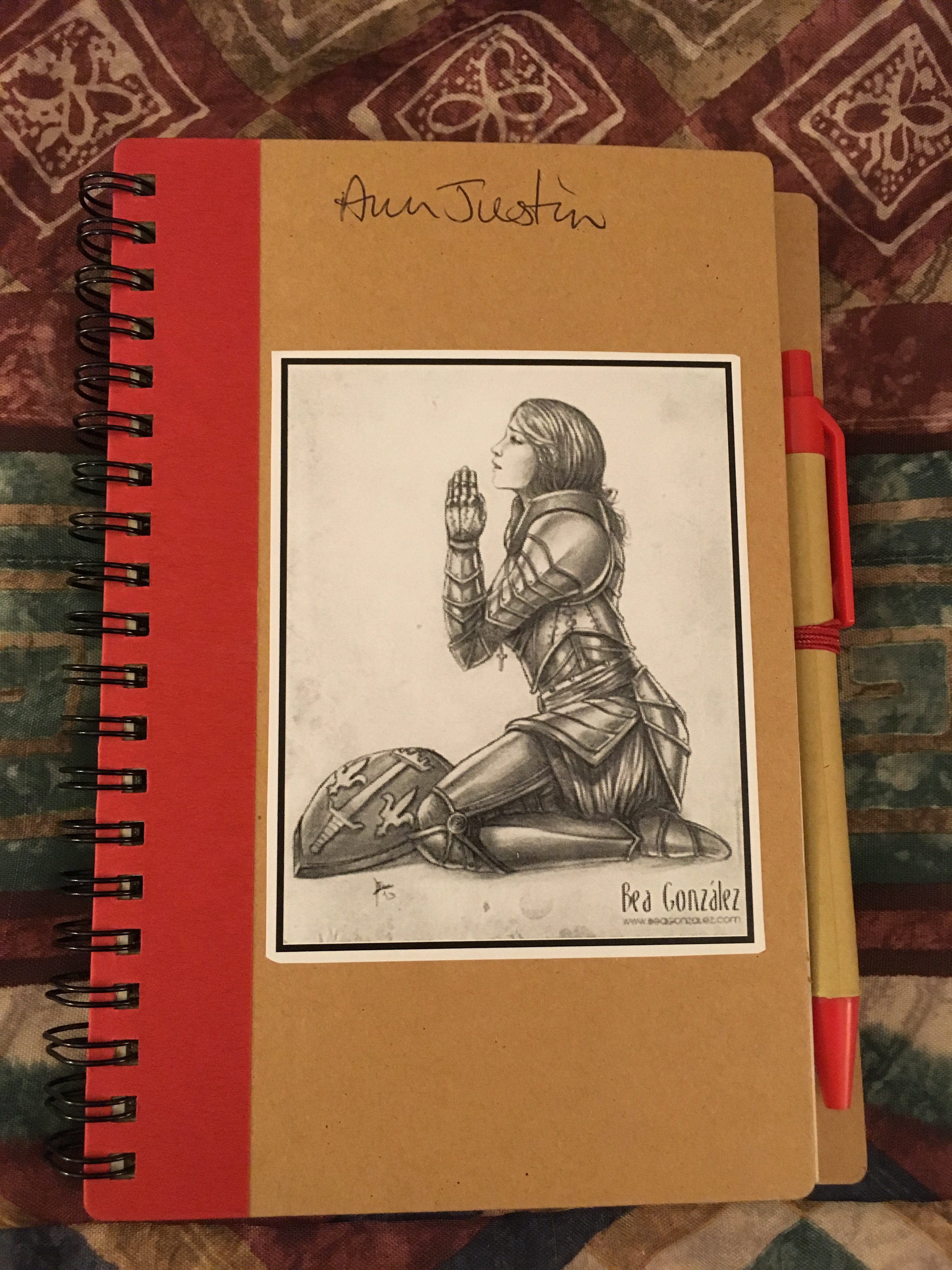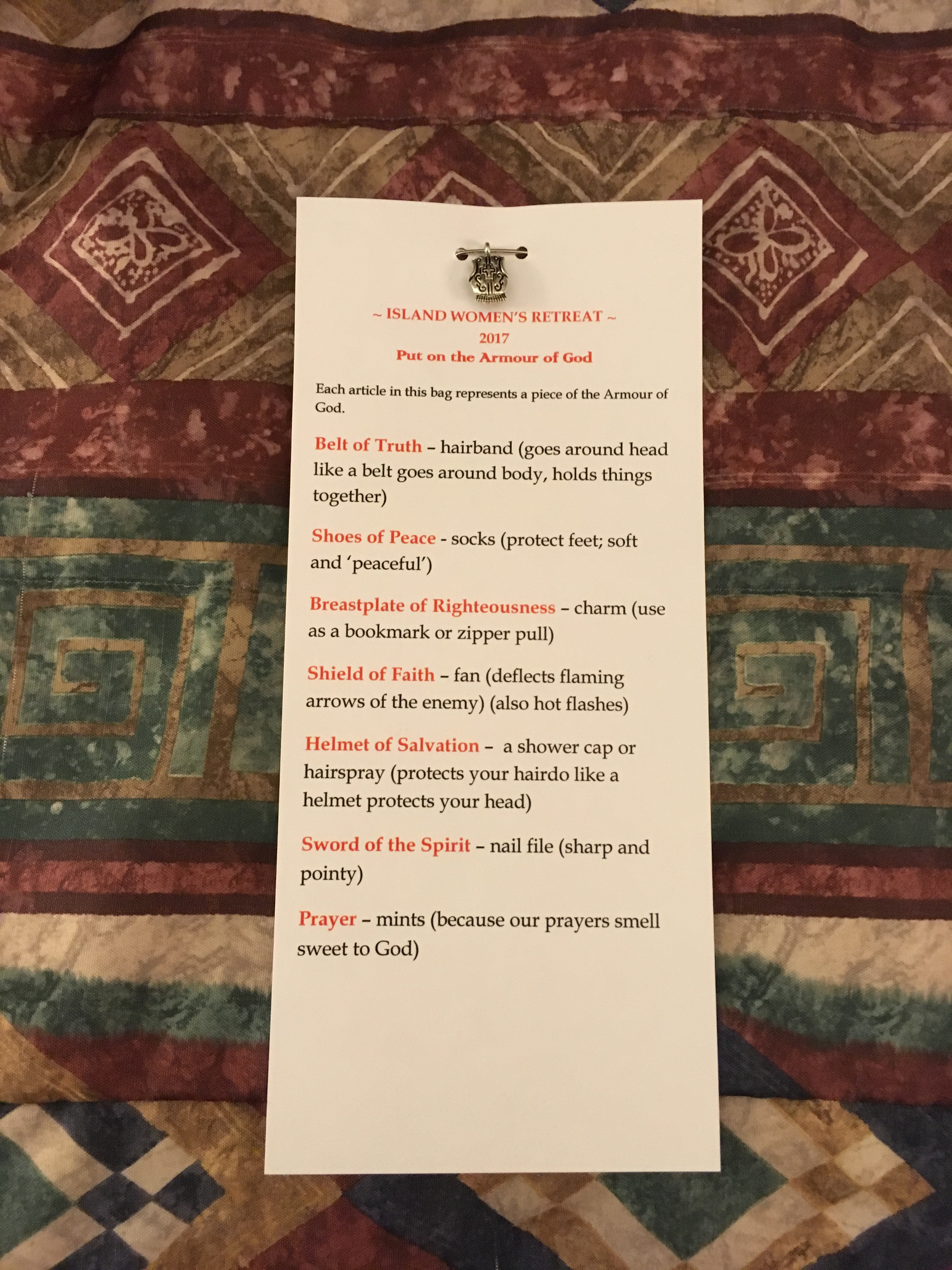 I took out a small card with a pin at the top. This card explained the contents of our baggies, which matched the theme of the retreat, “Put on the Armour of God”.