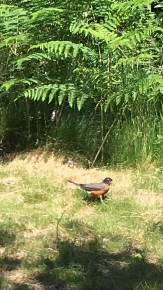 My husband always called robins “kwaitskwaik” (not properly written, sorry, but a phonetic approximation) in his own language, so that word always comes to mind. I do love seeing them and these seemed to be seeking the shade. The sun was hot!