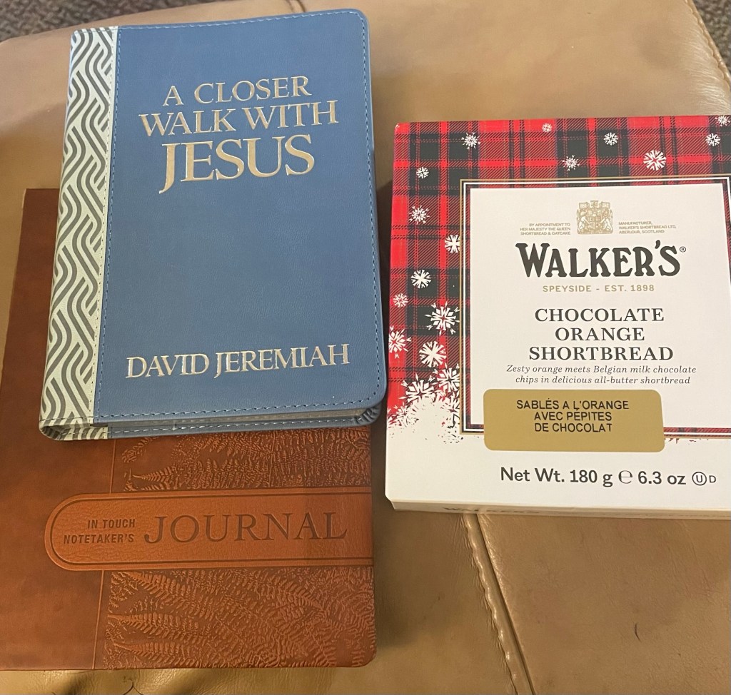 Another church friend for many years, both here and in my former community, dropped by, a brief visit to bring a beautiful gift! A lovely David Jeremiah devotional and a very nice journal for sermon notes etc, and a box of delicious shortbread! 😋